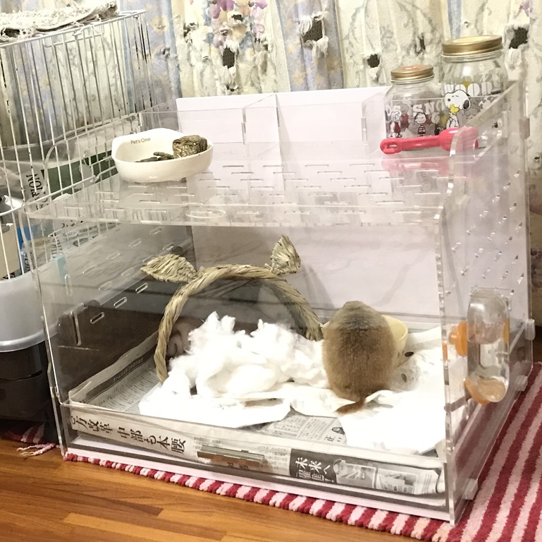 今朝のナッツは、自分のハウスでエサを食べているところと別のハウスへティッシュを持ち出しているところです。